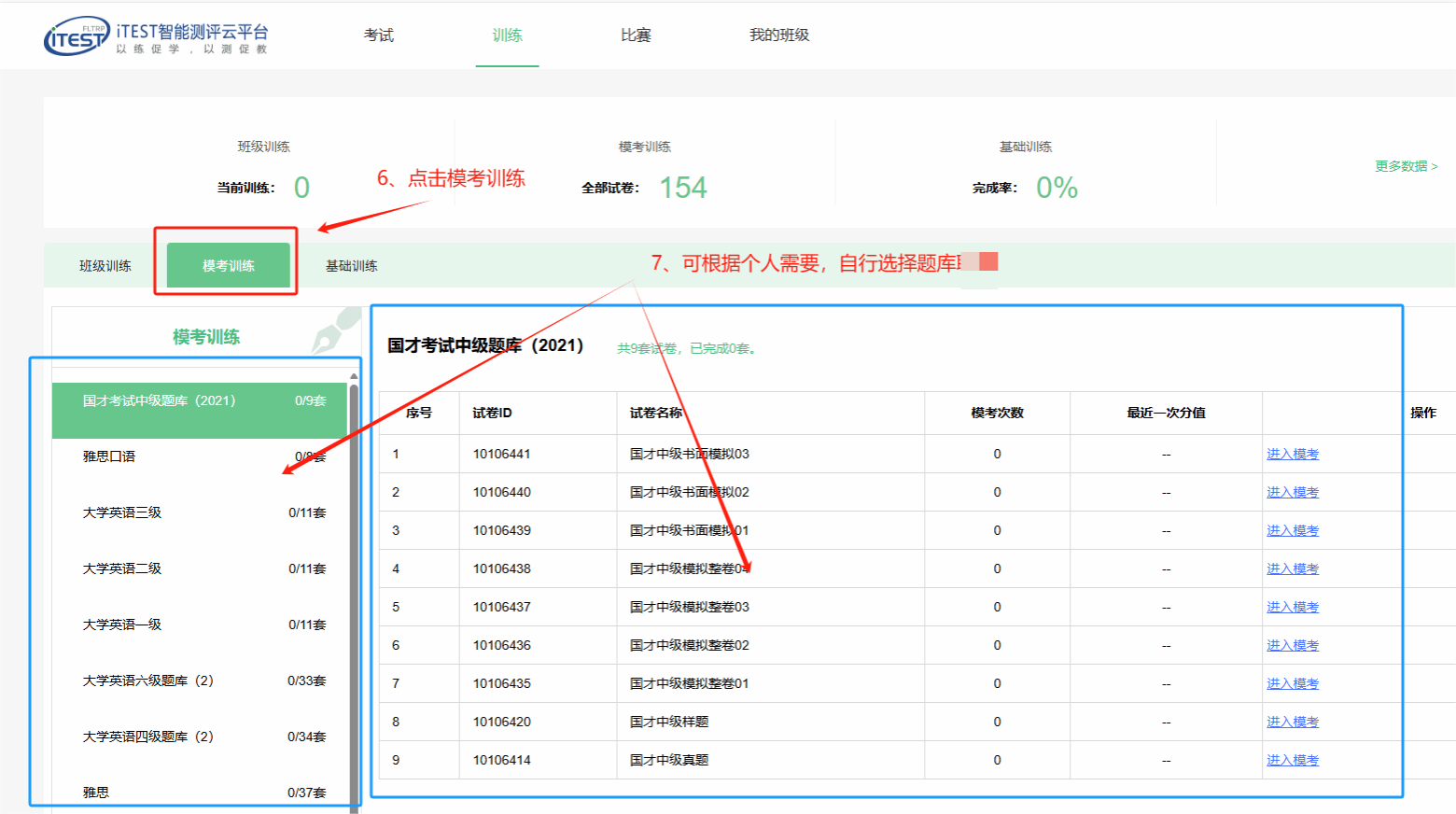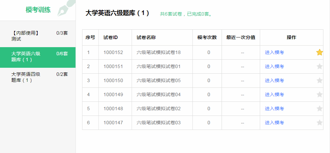 在“模考训练”中,学生可在左侧选择不同的试卷类别,然后在右侧选择相应的各套试卷进行模考。此外,点击右侧“⭐”标志,可加入收藏夹。