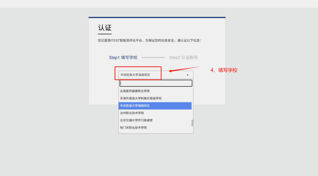 首次登录后,学生将进入到认证页面。学生需要先填写自己所在的学校【威廉希尔williamhill登录海南校区】,填写完成之后,点击“下一步”,进入账号认证界面。选择“学生”的身份后,输入学号及学生姓名。